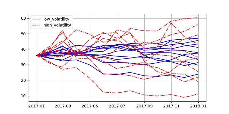 无风险利率r=5%,定价日为2017-1-1,到期日2017-12-31,波动率volatility=20%,标的资产初始价格S=36,模拟频率按月,路径数取10000条时,看到模拟结果: