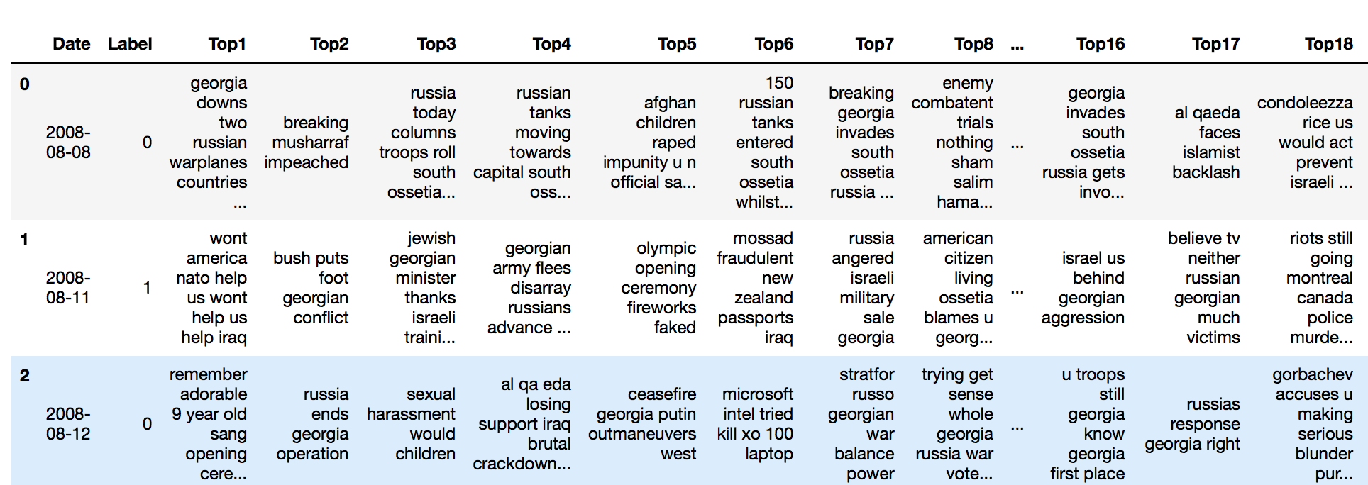 项目用到的数据集来自kaggle,共包含1989条记录,每条记录包含每天的Top25条新闻,目标是通过对新闻的词频分析判断股市涨跌。